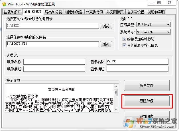 2、到釋放的目錄修改、添加等完成后,再點擊新制選項卡。瀏覽支解壓的目錄和保存Wim文件的地方,填寫描述、名稱等,點擊新建鏡像即可。