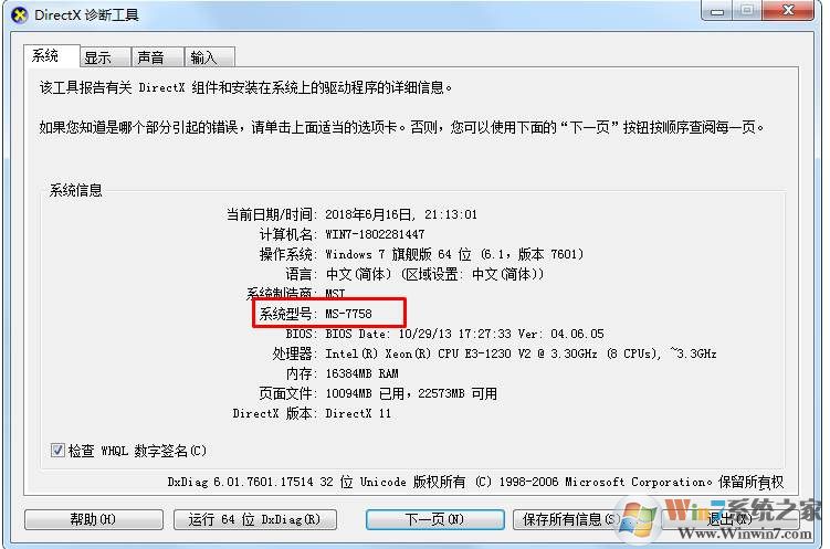 主板型號怎么看方法二:系統(tǒng)directx工具