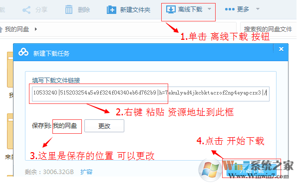 3、把下載連接粘貼到離線下載任務中,選擇保存位置,然后點擊開始下載;(有些文件下載很快,因為百度網盤上本身就有)