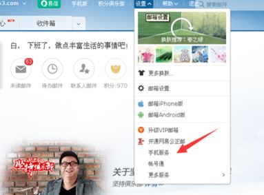 2、在界面的最頂端,有一排選項,其中有一個設(shè)置選項。我們點擊一下之后會彈出一個下拉菜單,其中有一個手機服務(wù),我們點擊一下進入設(shè)置,如圖: