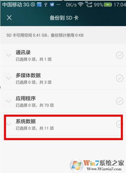 3、新建一個備份,可以看到有很多的備份種類,這里只選擇系統數據即可,因為wifi密碼是系統數據中的!