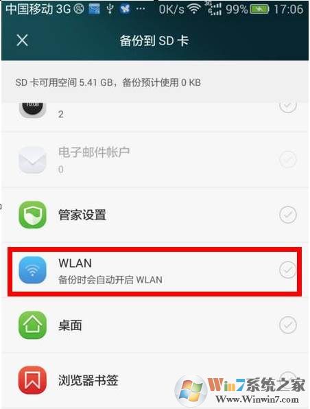 4、下拉滾動,找到wlan選項,連接過的wifi密碼就是保在這個的??!勾選wlan,開始備份!