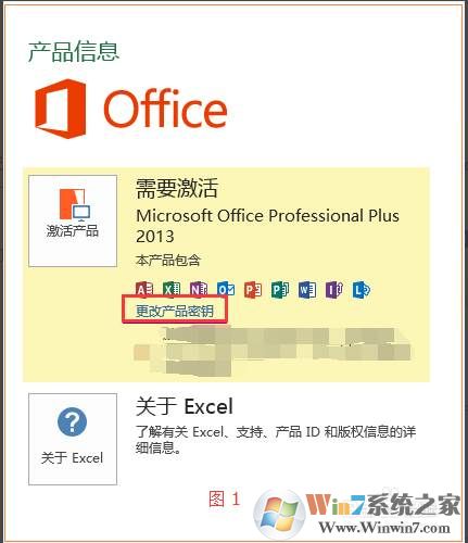 打開Microsoft office 2013任一應(yīng)用界面,選擇賬戶,在右邊Office產(chǎn)品信息下面,點(diǎn)擊“更改產(chǎn)品密鑰” (如圖1)。