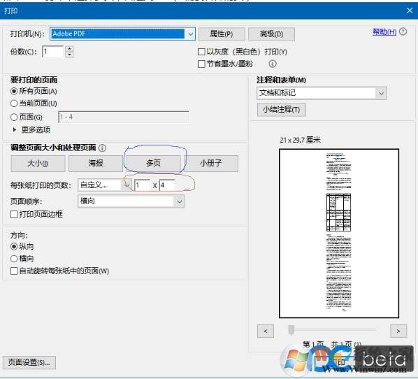 3、打印設(shè)置中選擇多頁(yè),自定義1*X(X需要合并的頁(yè))