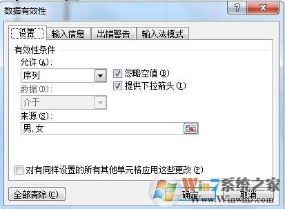 2、在新出來的對話框中,打開“設(shè)置”選項卡,“允許”中選擇“序列,在“來源”中輸入“男,女”,此處注意,“男,女”之間的逗號為英文逗號。然后勾上“忽略空置”和“提供下拉箭頭”。點擊確定即可