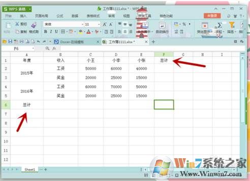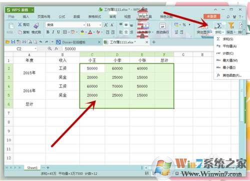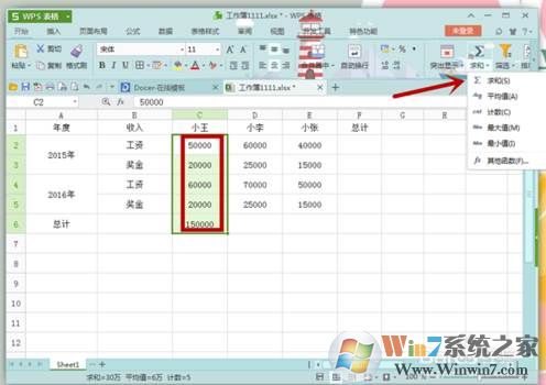 6、如果我們只是單求一列或者一行的和,只要選擇所在的行或者列的數(shù)據(jù),點擊“Σ”然后選擇“求和”就可以了。那么這一行或者這一列的求和結果就顯示出來了。