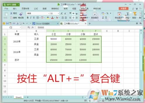 “選中”數(shù)據(jù)后,按住“Alt"+"+="復合鍵之后,就可以顯示出”求和結果“了。特別的簡單易操作,只要記住“Alt+=”是求和復合鍵就可以了。
