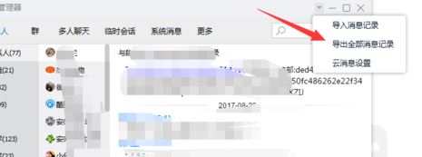 2、然后點(diǎn)擊右上角的倒三角形,下拉的菜單中選中導(dǎo)出全部消息記錄,如圖所示: