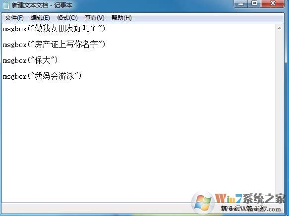 2、然后打開文本文檔,輸入以下代碼;(字可以改,話的多少也可以增加復(fù)制 msgbox("XXXX") 雙引號里加內(nèi)容就行,可以加很多很多,不過那就是惡搞了。)Win7系統(tǒng)之家 cncxm.com 整理