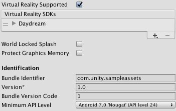 5、In Build Settings > Player Settings >Other Settings select: 虛擬現(xiàn)實(shí)支持和從下拉列表中選擇Daydream。確保你在最低API級(jí)別中選擇Android 7.0(或更高)否則Daydream將不會(huì)顯示,你會(huì)得到一些關(guān)于manifest文件的錯(cuò)誤! 如下截圖所示: