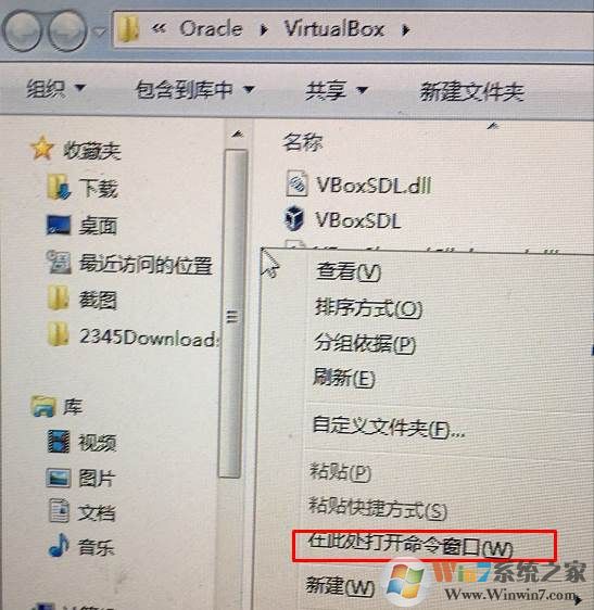 4、進(jìn)入VBOX安裝目錄后,在空白的地方,按住SHIFT鍵,然后點(diǎn)擊右鍵,選擇“在此處打開(kāi)命令窗口”;