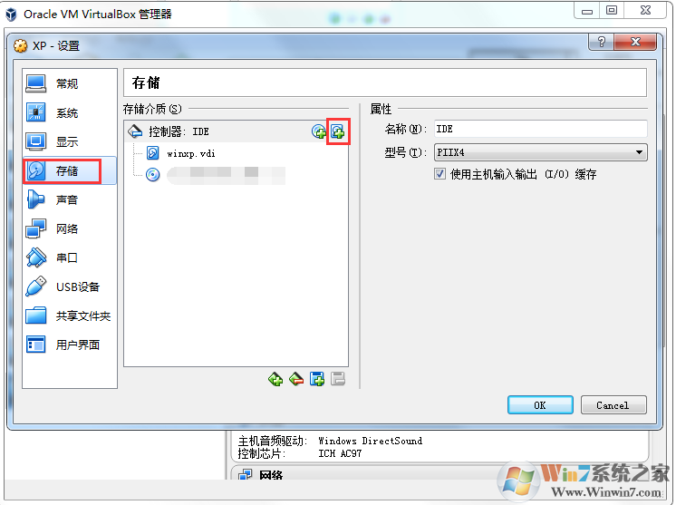 8、打開(kāi)儲(chǔ)存后,在控制器IDE 后面點(diǎn)擊 加號(hào);Win7系統(tǒng)之家cncxm.com
