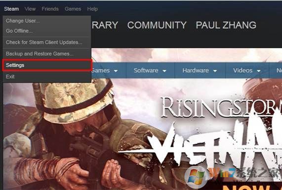 2、打開Steam后點擊左上角的Steam按鈕,會滑出幾個選項,選擇Settings(設(shè)置)