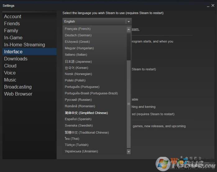 4、點擊Interface(界面)選項,第一項就是steam的界面語言設(shè)置,展開語言選項,找到簡體中文。