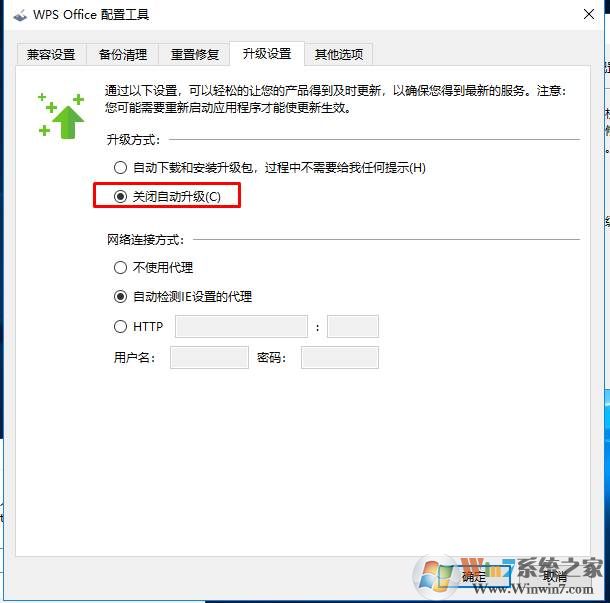 3、打開(kāi)之后選擇“升級(jí)設(shè)置”——選擇為關(guān)閉自動(dòng)升級(jí),然后確定