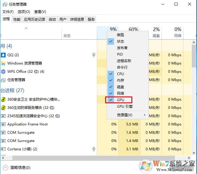 2、打開任務(wù)管理器之后,右鍵點(diǎn)擊CPU使用率那里,然后我們可以看到 勾選 GPU 一項(xiàng);