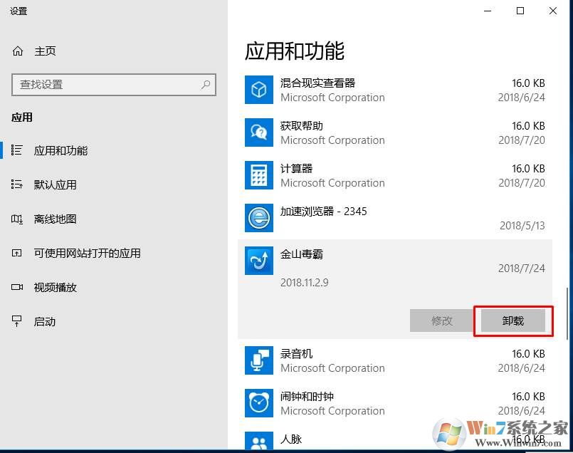 2、然后在應(yīng)用列表里,找到金山毒霸,然后點(diǎn)擊卸載;