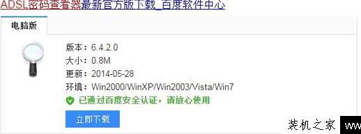 當(dāng)我們沒有使用路由器而是直接撥號的話,那么我們可以下載一個ADSL密碼查看器 點擊下載,然后點擊就可以查看帳號跟密碼了,如果沒有直接顯示出來,它一般自動保存在D盤,可以到D盤去查看文件。