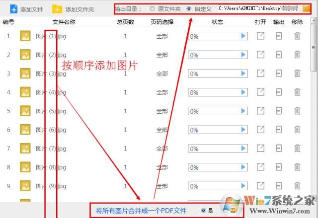 3、然后將這些圖片按照名稱順序依次添加到工具的列表中,然后在列表下方的“將所有圖片合并成一個PDF文件”選擇“是”,并設(shè)置文檔輸出目錄。