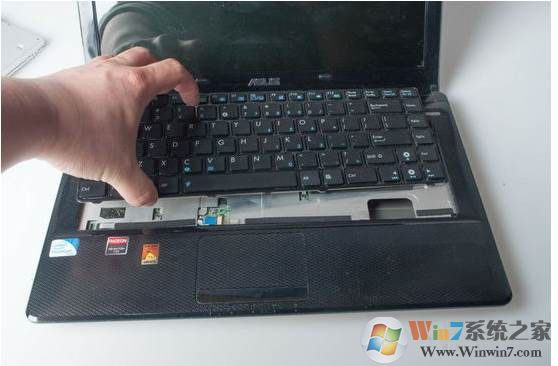 有很多筆記本的螺絲是隱藏在鍵盤下面的,所以我們要先把鍵盤拆下。拆下鍵盤后我們就可以看到厚厚的灰塵了。鍵盤底部是灰塵較為集中的地方,所以此處需要好清理。去除表面灰塵后我們接著往下拆。
