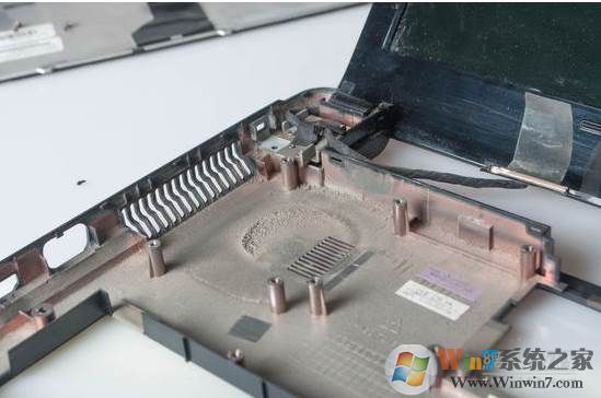 如果你將筆記本徹底拆除了,建議你將機(jī)身底板也好好清理一下,看一下圖片你就清楚了,由于這部分在底部,所以也是最容易堆積灰塵的地方。