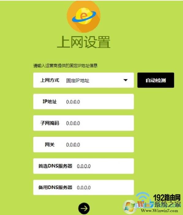 這時(shí)候請?jiān)?ldquo;上網(wǎng)方式”選擇:固定IP地址——>然后填寫寬帶運(yùn)營商提供的IP地址、子網(wǎng)掩碼、網(wǎng)關(guān)和DNS服務(wù)器地址——>點(diǎn)擊:箭頭。