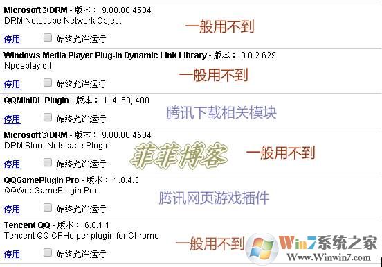 其中除了Flash插件外,其他不需要的完全都可以禁用掉,比如QQ自帶的各種插件包。。