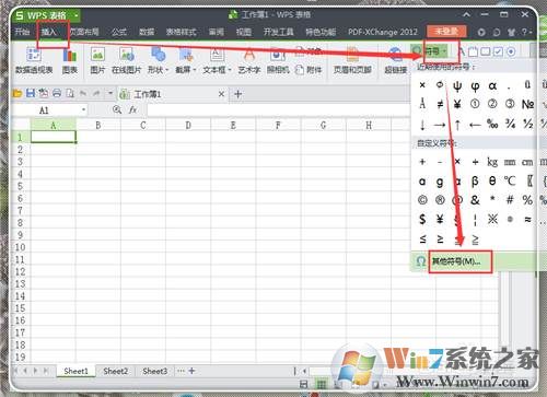 3、進(jìn)入excel中或是Word中,點擊“插入”,點擊“符號”后面的倒三角形,點擊“其他符號”。