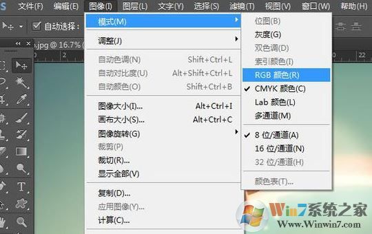 1、在PS菜單欄中點擊 【圖像】--【模式】--【RGB顏色】;