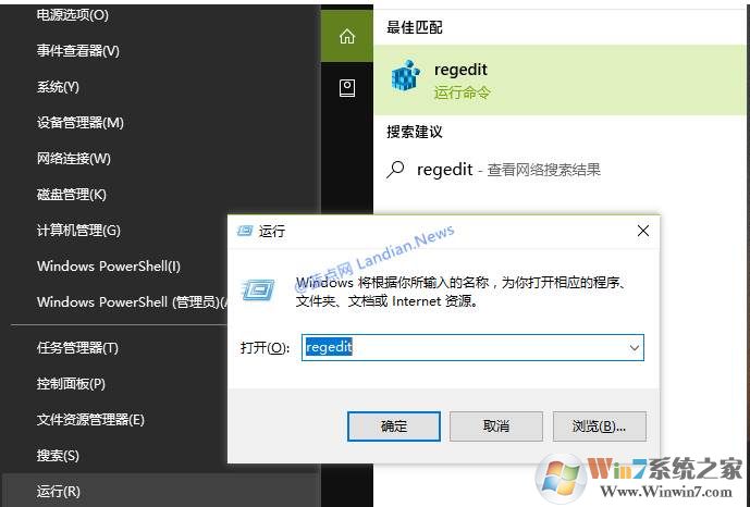 1、打開注冊表編輯器:右鍵點擊開始菜單然后選擇運行并輸入regedit點擊確定,或直接在小娜的搜索框輸入regedit也可找到: