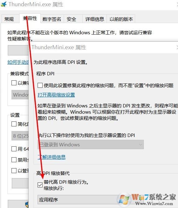 在Windows10的最新幾個(gè)版本中,可以自定義第三方軟件的DPI縮放。對于顯示模糊的軟件,找到并選擇其主程序,右鍵打開屬性,在兼容性標(biāo)簽頁中,選擇更改高DPI設(shè)置,在打開的對話框中,勾選“替代高DPI縮放行為”,然后在下拉框中選擇“應(yīng)用程序”,之后關(guān)閉打開的窗口,重新打開軟件,應(yīng)該就不模糊了。以迅雷官方精簡版為例,如下圖所示: