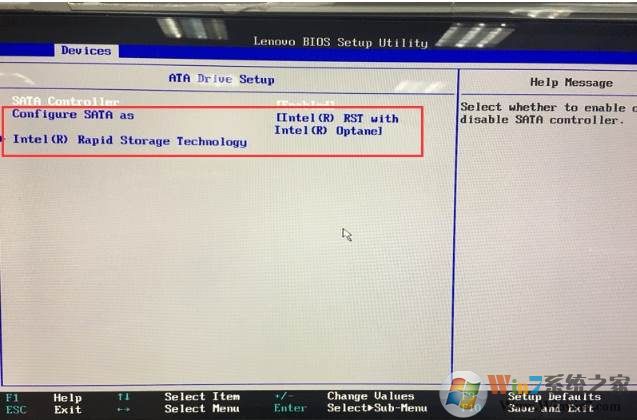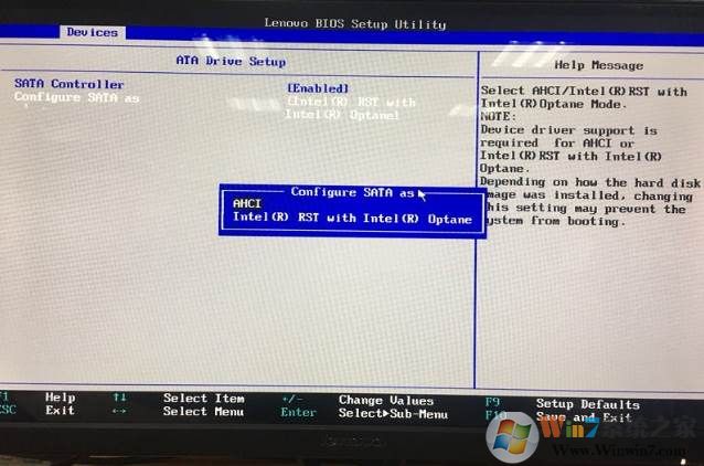 有很多聯(lián)想臺式機(jī)采用了intel的Optane,Optane是一種超高速內(nèi)存新技術(shù),兼容NVMe存儲協(xié)議,但是在裝有Optane的電腦上,很多朋友發(fā)現(xiàn)在重裝系統(tǒng)時會出現(xiàn)硬盤無法識別的情況,這是由于在安裝系統(tǒng)前未在系統(tǒng)下將Optane禁用或者在BIOS中未將BIOS setup->device->ATA drive setup->configure SATA as設(shè)置為AHCI導(dǎo)致的。如下圖: