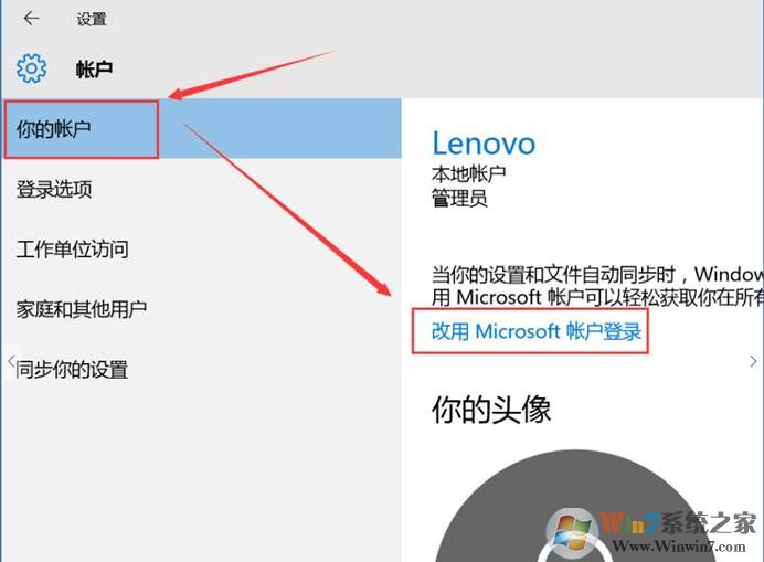 2、 在彈出的設(shè)置頁面中選擇“你的賬戶”——單擊“改用Microsoft賬戶登錄”,如圖: