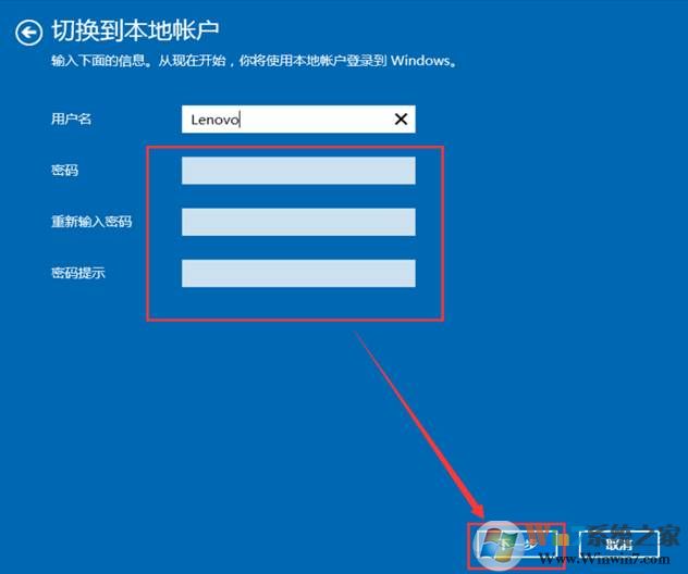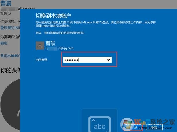 4、 輸入當(dāng)前本地賬戶密碼點擊:“下一步”。切換完成。(如果本地賬戶無密碼保持空即可)