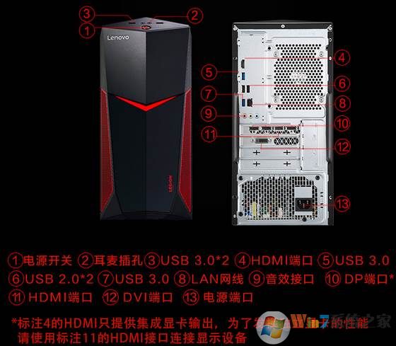 如下圖,聯(lián)想的一款高性能臺機(jī),同時(shí)有集成顯卡(HDMI接口)和獨(dú)立顯卡(DVI+HDMI接口),如果顯示器和集成顯卡連接,那么只會使用集成顯卡來工作。