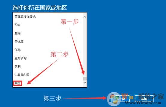 4、A-Z排列,中國在最后一個,翻動到最下方,選擇中國,點(diǎn)擊下一步;