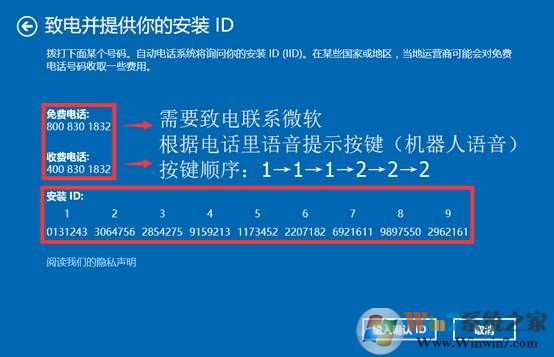 把9組安裝ID分別根據(jù)語音提示,按鍵輸入。用紙和筆記錄下,語音播報(bào)的激活I(lǐng)D。依次分組輸入,點(diǎn)擊““激活Windows””即可。