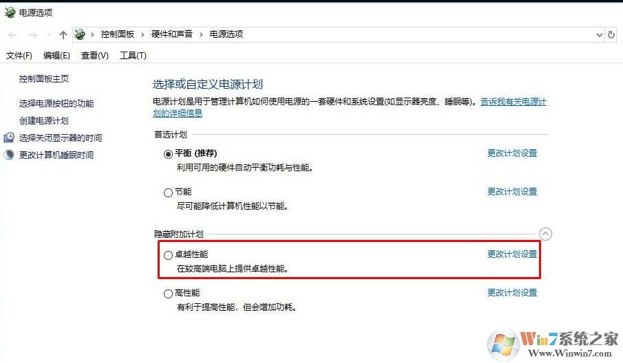 此時再打開電源計劃管理選項,展開隱藏的附加計劃后,選擇 卓越性能 模式就可以讓電腦性能最大化了,據(jù)測試性能將有10%的提升。