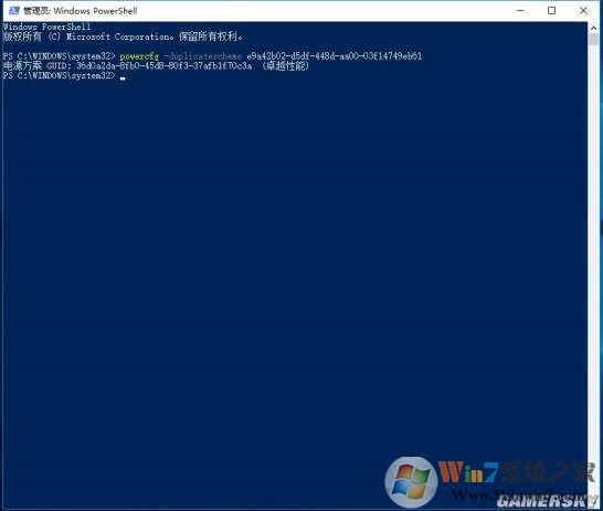 2、開啟“Windows Powershell”程序后,再輸入命令“powercfg -duplicatescheme e9a42b02-d5df-448d-aa00-03f14749eb61”(不含引號,可以直接復(fù)制粘貼),再點擊回車,就會顯示“電源方案 GUID:36d0a2da-8fb0-45d8-80f3-37afb1f70c3a(卓越性能)”的提示,這樣就表示已經(jīng)開啟“卓越性能”模式了。