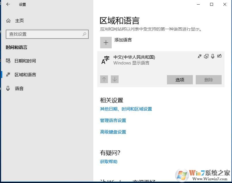 1、按下win+i組合鍵打開“設(shè)置”,然后依次【時間和語言】>>【區(qū)域和語言】,在右側(cè)看下中文是否是在最上面的,(如果不是那么點擊箭頭把中文設(shè)置為第一個默認(rèn))如圖: