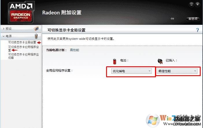 或者:在“電源”選項(xiàng)下“可切換顯示卡全局設(shè)置”或者“可切換顯示卡應(yīng)用程序設(shè)置中”就可以設(shè)置雙顯卡切換了,“節(jié)能”是集顯,“高性能”或者“最大化性能”是獨(dú)顯。