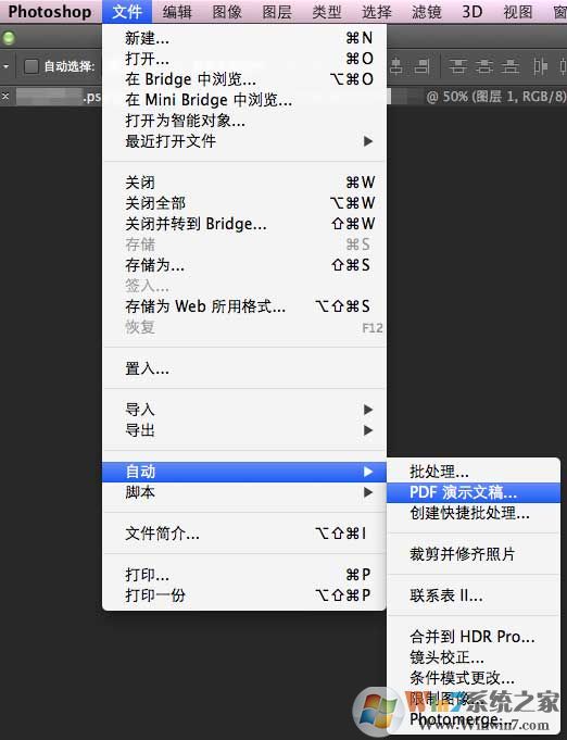 1、首先打開PS軟件,然后點(diǎn)擊菜單欄上的【文件】——【自動】——【PDF演示文搞】,如下圖;