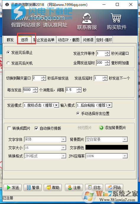 5、在選項(xiàng)這里,可自定義設(shè)置延時(shí)發(fā)送,發(fā)送時(shí)間,發(fā)送完成關(guān)機(jī)等各種設(shè)置