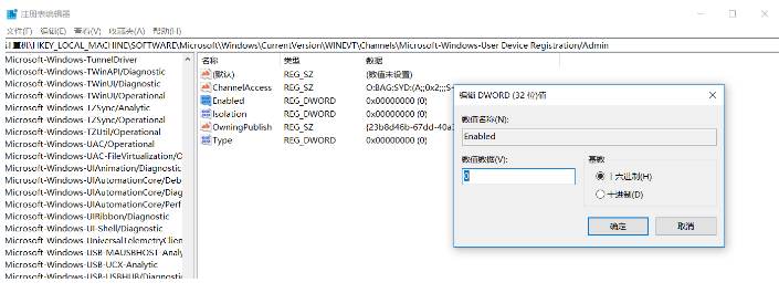 2、然后打開注冊表編輯器,我們定位到 HKEY_LOCAL_MACHINE\SOFTWARE\Microsoft\Windows\CurrentVersion\WINEVT\Channels\Microsoft-Windows-User Device Registration/Admin
