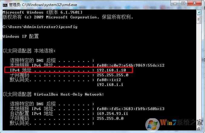 1、首先我們要知道要訪問(wèn)的電腦IP地址,可以在CMD中使用ipconfig命令來(lái)得到IP地址,如下圖一臺(tái)Win7系統(tǒng)電腦的IP地址。ipv4地址就是了 得到地址192.168.1.10