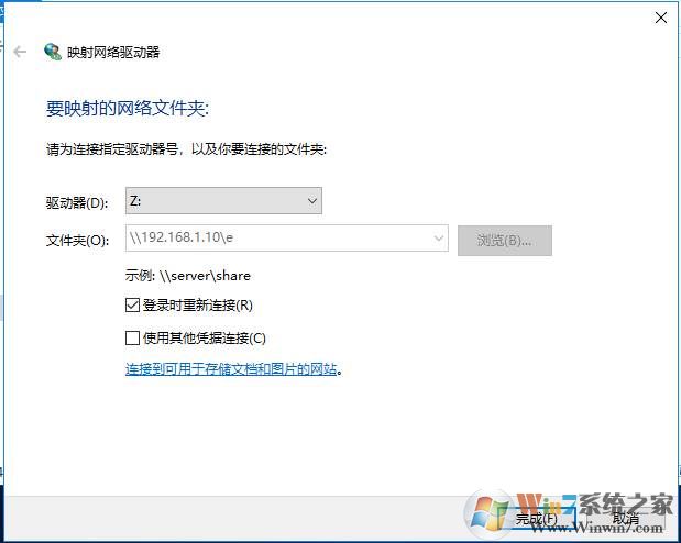 2、接下來,我們可以看到設(shè)置界面,設(shè)置一個驅(qū)動器號,如Z:,文件夾就是你所共享的文件夾或是磁盤了。