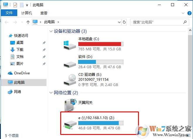 3、打開我的電腦之后,我們就可以在網(wǎng)絡(luò)位置處看到我們剛才映射的共享磁盤了,還可以看到總共容量、可用空間等信息,方便多了。