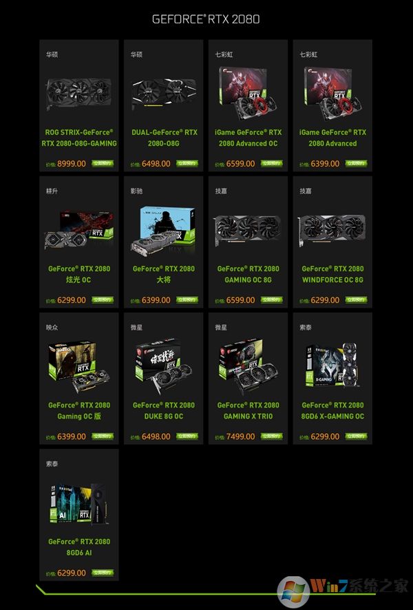 從下面可以看到,華碩、七彩虹、耕升、影馳、技嘉、映眾、微星、索泰都發(fā)布了自己最新的產(chǎn)品,RTX2080價格在6000-6500左右,其中華碩最貴,8999.00元,這個還不如直接上2080TI吧。