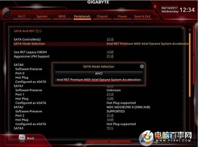 2、將硬盤模式改為Optane 相關(guān)。將磁盤工作模式從AHCI改成Intel RST模式。切記一定要先設(shè)置BIOS再安裝系統(tǒng),先安裝系統(tǒng)再更改硬盤模式將導(dǎo)致系統(tǒng)崩潰(如果沒有intel RST那么改成RAID也是可以的)
