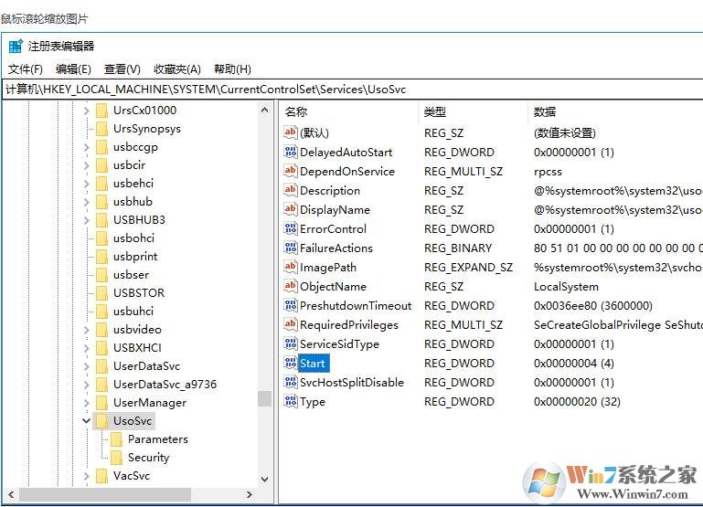 定位到:[HKEY_LOCAL_MACHINE\SYSTEM\CurrentControlSet\Services\UsoSvc]